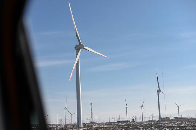 在乌鲁木齐去吐鲁番的途中,沿路南行,在通往丝路重镇达坂城的道路两旁,巨大的风力发电机擎天而立、迎风飞旋,在广袤的旷野之上,这里是雪山下的风车天堂。