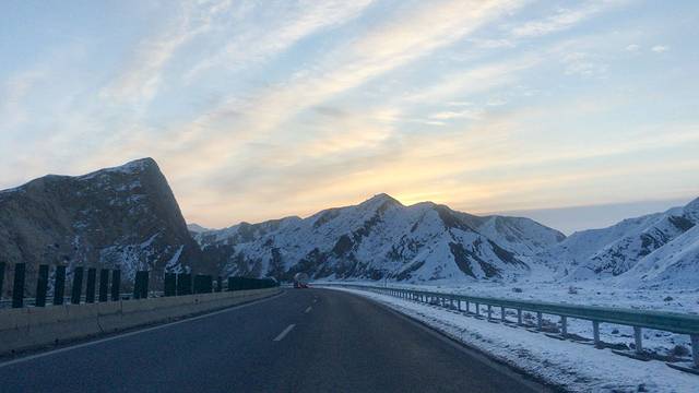 无论是车窗边的日落,公路两旁的高山,还是天山边脚下旋转的风车,都让人流连忘返。