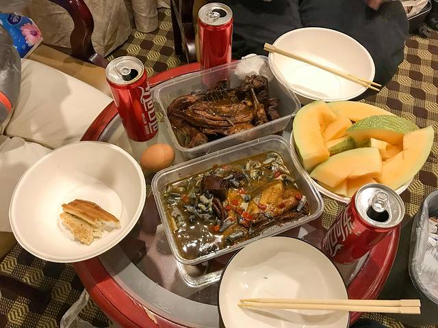 小可爱弟弟还千辛万苦找了一家小店订了大盘鸡吃。现在的非常时期,在这里要找吃的已经不是容易的事情了。大盘鸡好吃 哈密瓜超甜。
