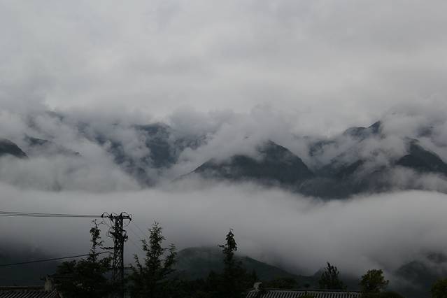 8月11日 不下雨,天雾蒙蒙,下图的景色是看不到了。上去西藏的路昨天已经塌方抢修中了,也断了我们进藏的想法,掉头返程,路上也经过不少落石区域。傍晚回到了大理的双廊,双廊正在进行整治,游人不多。