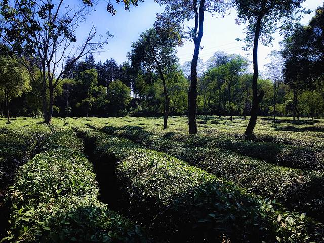 虽然现在已不是采摘茶叶的时节,但是温暖的南方气候还是令这里的植物保持着翠绿。万亩茶园里,满坡的茶树显着深绿色,一眼看去心旷神怡。