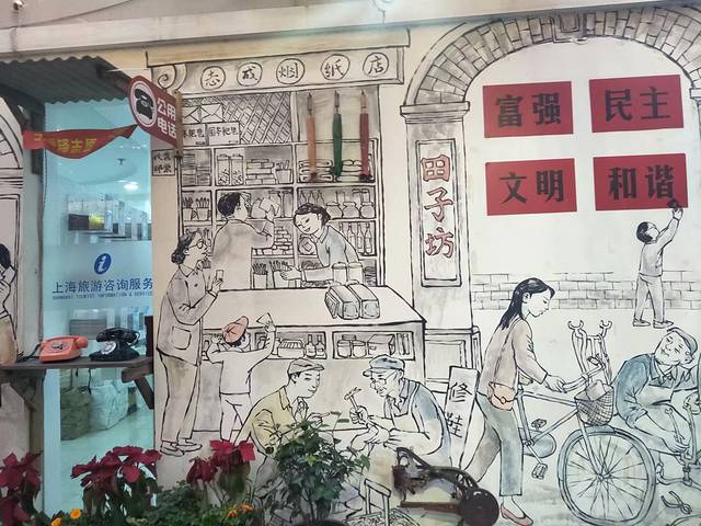 田子坊,相当于北京的南锣鼓巷,商业气息浓厚,卖大白兔奶糖、上海女人香水香膏、旗袍、文创产品、上海特色酥糖甜点等。