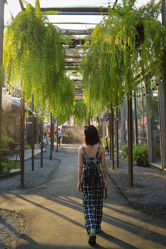顺着飞机头的方向,走进green zone,一切变得清新起来。通过一条铺有绿植的走廊,两边时而喷出水雾,清凉消暑。周围建筑物以低矮古旧的小木屋为主,散布着很多创意装置,非常适合拍照。