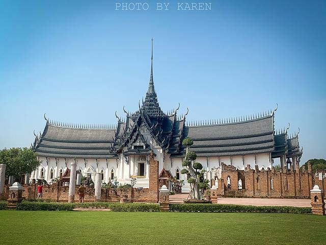 这是大城王朝晚期国王皇宫内宝座大殿,原建筑早已在缅甸战争中损毁。建造者Lek先生根据考古依据,耗资5亿泰铢按照皇宫原貌1比1还原,据说就连建筑材料都是一模一样的。外部风格以大城时期的图案为主,纯白色高贵简洁。殿内屋顶上全是真金打造,还有一尊纯金佛像供奉在殿中。整个内部非常精美,可供参观,不能拍照。