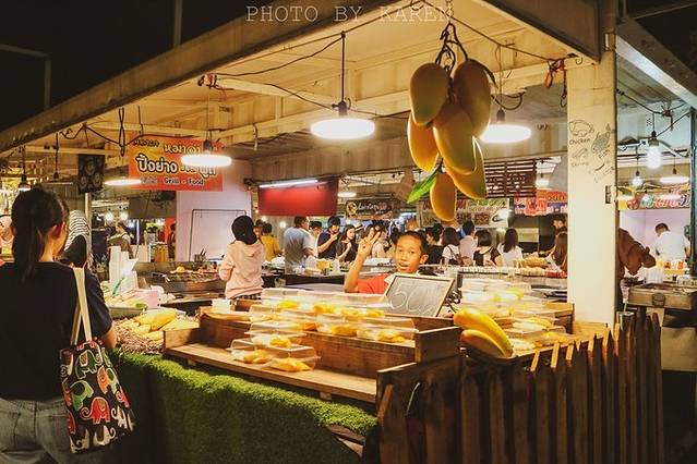 继续往里走又出现了一片小吃摊,跟最外面的不一样,这里倒是多了很多当地人,招牌也大多是泰文,老板甚至都不会英文。除了各式各类的泰国美食之外,还贩卖各种衣服、饰品、手机壳等小物件,倒有点台湾夜市的味道。在这里更多的是看到当地人的生活气息,亲朋好友围坐一起的热闹,老板的淳朴善良,还有芒果摊那个皮肤黝黑的小孩比“耶”的可爱。