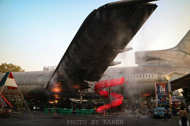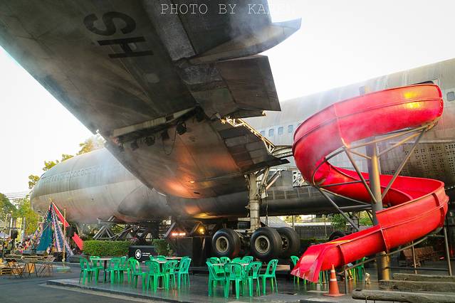 长长的机身前面摆满了桌子板凳,机头下搭建了一个小型的帐篷舞台,还有一个通向机舱的红色大滑梯。据说到了晚上,这片露天小广场会有泰国当地乐队的live表演。