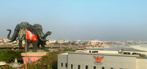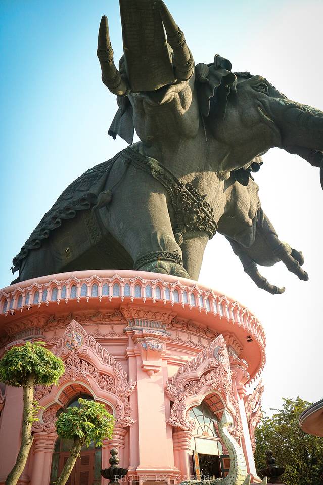 当我们乘坐BTS 快到Chang Erawan站的时候,从车窗里远远就看到了三头神像的全貌。巨型的象身,三面一模一样的象头,傲然屹立在粉色宫殿之上,视觉效果非常震撼!