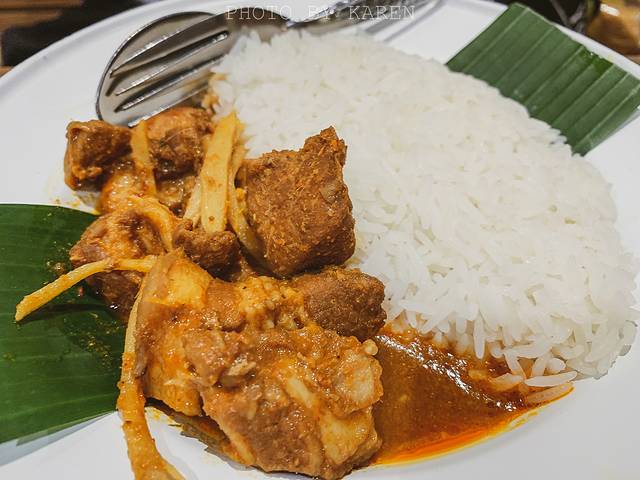 前菜是Ma Hor,光是摆盘的造型就很抢眼。这道算是这家店主打的创意菜了,玻璃杯里面是某种植物的叶子加上肉松、花生、橘子还有叫不出名字的材料,必须是连叶子一口吃下,它的口感非常的有层次。有点怪怪的味道,但还算是那种能吃得下去的。一边的荷叶垫上,配料是用猪肉末、大蒜和花生碎炒在一起放在橘子上的,一口下去同时会感受到甜味和辣味,非常的好吃。中间的锅巴配蘸秘制的辣椒酱,总之这道前菜蛮特别的。