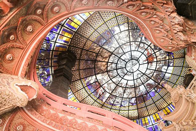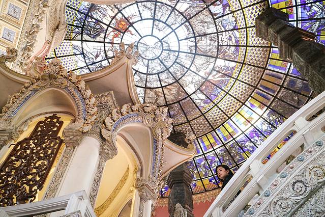 “人间”便是大厅部分,也是整个博物馆最美的地方。进入其中,就被眼前的画面深深吸引。整个大厅空间通透明亮,富丽堂皇,连每个微小细节都是独具匠心般精雕细琢,完美诠释建造者对艺术的极致追求!抬头望向天花板,欣赏来自西方玻璃彩绘,乍一看倒和高雄美丽岛捷运站的穹顶有几分相似。仔细看竟然内有乾坤,彩绘中蕴藏着世界地图和十二宫图,真是有趣又精美的艺术之作。