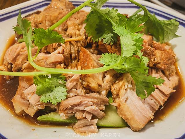 水门鸡饭的搭配,是一份海南鸡饭(鸡肉+米饭),一小碗鸡汤和一小蝶蘸酱。鸡肉嫩滑,咀嚼起来有弹牙的口感,不干也不油腻,再蘸秘制的泰式辣椒酱,可以单独蘸着吃也可以加在饭里。用鸡骨高汤炊煮的米饭带着淡淡的鸡油香,泰国香米粒粒分明,吃起来有淡淡的咸香,回味无穷。那一小碗鸡汤,饱含精华,特别好喝。我们单独点了一份排骨汤,以为是一人份的例汤,结果是一大碗,里面还有满满的排骨!汤很鲜美,便宜大碗太实在了。一份卤肉,卤汁浓郁,肉质鲜美,配有清爽的黄瓜。