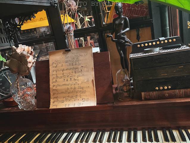 复古木质与绿植的搭配,充满整个咖啡店。店内摆满了各种瓶子、古董家具、年代久远的自行车和摩托车……每一件摆设都是艺术收藏品。