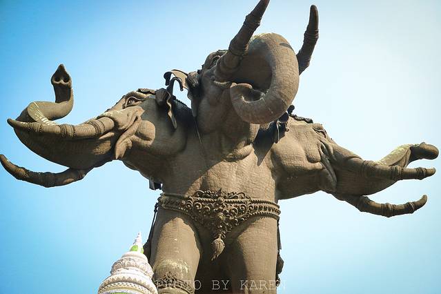 众所周知,大象是泰国的国宝,泰国人民对大象有种特殊的情感。相传三头象是泰国民间故事中的象神,因象神是婆罗门教中的一位天神的座骑,象神神通广大,不论什么妖魔鬼怪都不是他的对手。这座以三头象为主题的博物馆,于1994年开始建造,历时12年,雇佣当地大量工艺美术师以手工精雕慢慢修葺而成的。传说在修建过程中曾有多次神迹发生,后来每天都有很多民众前来参拜。三头神像,便由此被称为有求必应的象神。