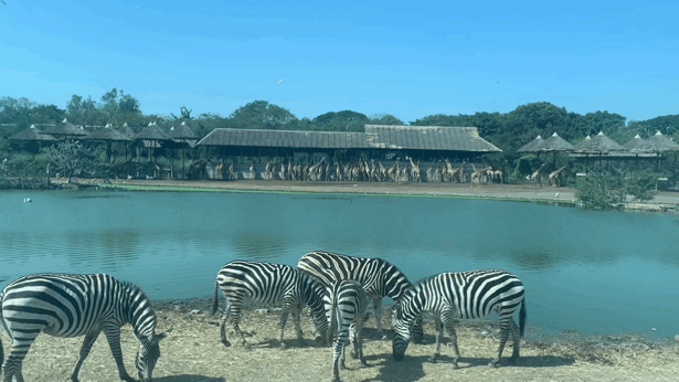 几只悠闲的骆驼躲在斑马群里,在斑马后方不远处还能看到长颈鹿喂食区。一大片成群结队的长颈鹿等待游客喂食,场面蔚为壮观。随之而来,还能看到鸵鸟在绿林间草地上漫步或戏耍,水鸟、鸳鸳和天鹅在水中悠闲游弋。 一片和谐自然的生活状态。