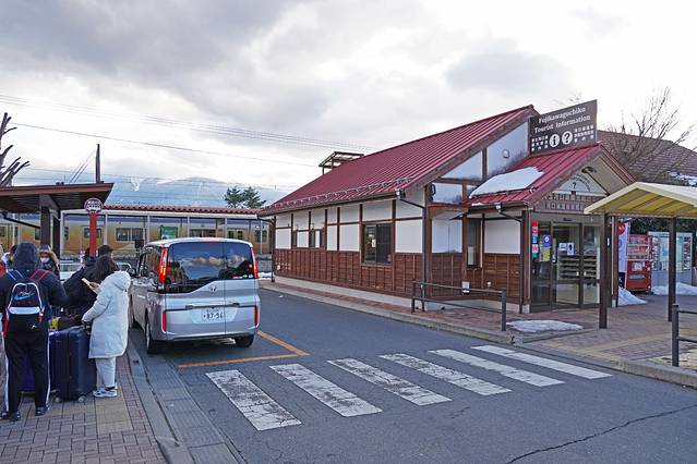 抵达河口湖站后,如果你定的酒店支持接车的话,只需要去车站的案内所让工作人员帮你免费联系酒店即可,随后在10号候车处等车来接就行。