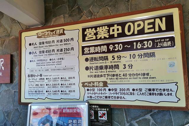 河口湖天上山公园可以步行上下,也可以乘坐缆车,缆车往返900日元,单程500日元,还有搭配游览船的优惠票。