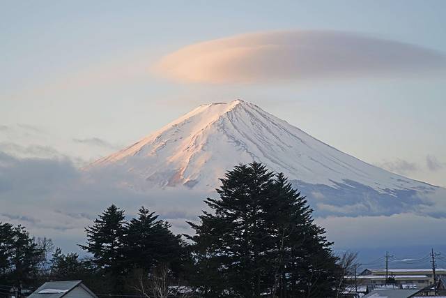 建议早起来看富士山,因为经过夜晚的降温,富士山顶容易堆积起积雪,而早上的浓云较为稀薄,大大增加了能见度。