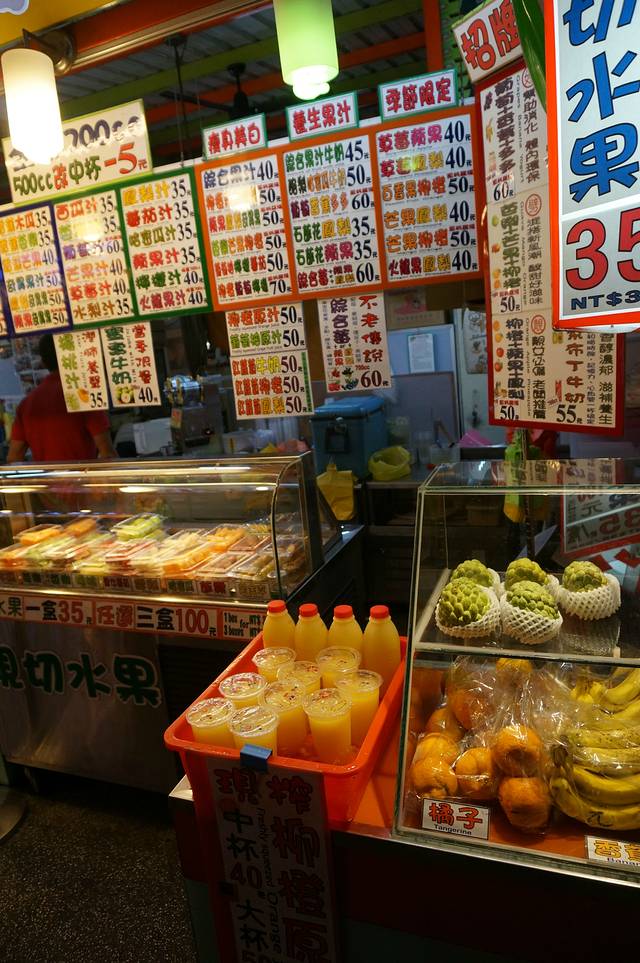市入口的奶茶铺先开门了,不过看着这花花绿绿让人密集恐惧的菜单,真不知道从何下手啊。早到的好处是,那些要排很久的人气店家可以早点拿号,比如烤肉点,早去晚去差别真的好大,台湾当地蔬菜每一种都让我很好奇,可惜一下子吃不了那么多。