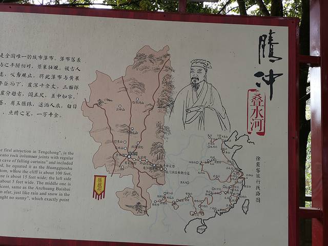 大盈江从北向南贯穿腾冲,在流经腾冲县城西时,遇到巨大的断层崖,水流从46米高的崖头跌下深潭,响声雷动,水花四溅,形成了“不用弓弹花自散”的壮丽景观,河水仿佛被叠为二折,故俗称叠水河瀑布。瀑布之上,有三座山峰耸立。瀑布之上山峰之间有一座石桥横跨江上,名为太极桥,工艺奇特,旁边有座石亭,匾刻“观瀑”二字,故名观瀑亭。从亭上看过去,桥下激流奔涌,雪喷云飞,如银河倒泻,在阳光下常现出七色彩虹,蔚为奇观。