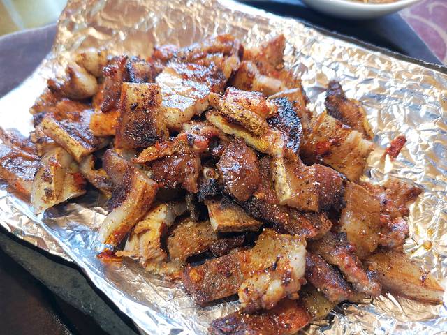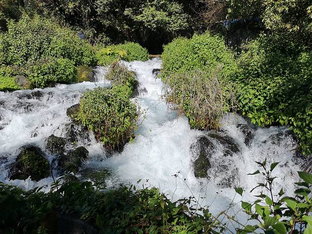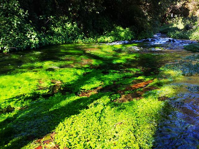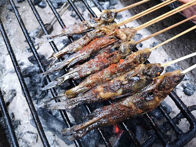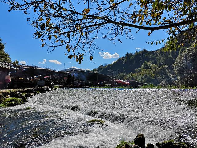 游览完柱状节理,可以回到停车场再前往黑鱼河景区。黑鱼河是两条地下暗流汇聚而成的河流,因为河中的小黑鱼而得名,河边有很多做烤鱼的摊贩。