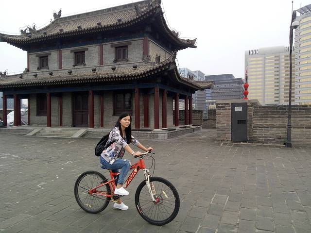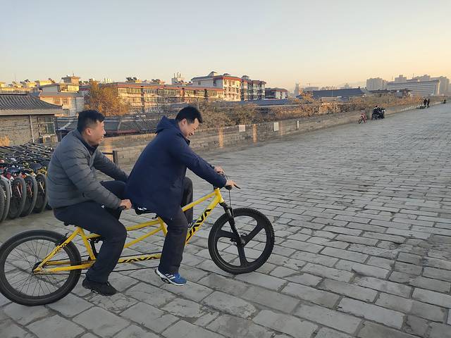 城墙上有自行车出租点,东南西北门都可以租车还车。这俩非要骑双人车。