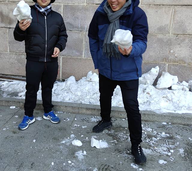 到了山间,气温降了许多。在墙下两个南方人第一次抓到了雪(没下雪,应该是露霜结冰),很兴奋。