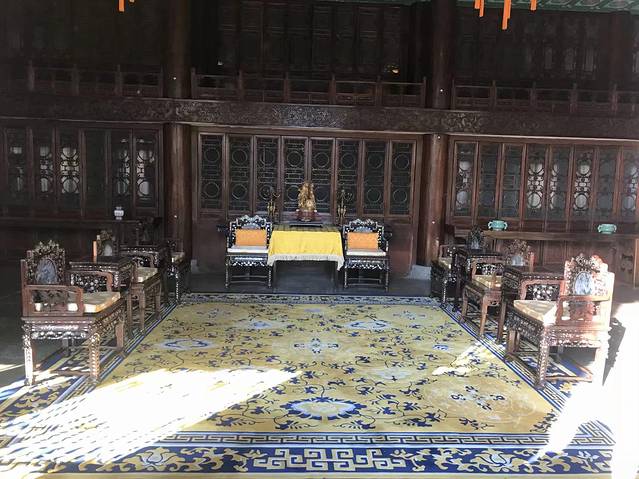 恭王府是现存王府中保存最完整的王府,由府邸和花园两部分组成,府邸不仅宽大,而且建筑也是最高规制。亲王府有门脸五间,正殿七间,后殿五间,后寝七间,左右有配殿。听说原来里面的梁柱、家具都是金丝楠或紫檀打造而成。很多建筑可以隔着玻璃参观内部。