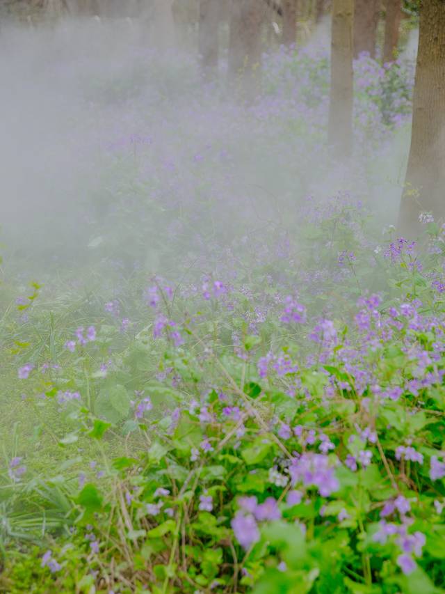跟着导游一直往前,就能来到雾森幻境,林深不知处,氧吧鸟语情,走进仙雾缭绕的林子,踩在如茵的绿草上, 高大的水杉林下绵延着温柔缱绻的紫,只见薄似轻纱的雾气蒸蒸腾腾,在五彩交织成的光影里,幻化出迷人的景致。