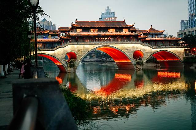 成都九眼桥是成都夜景必须要打卡的地方,安顺廊桥是明代的建筑,建于锦江之上。