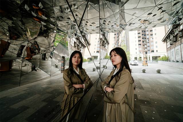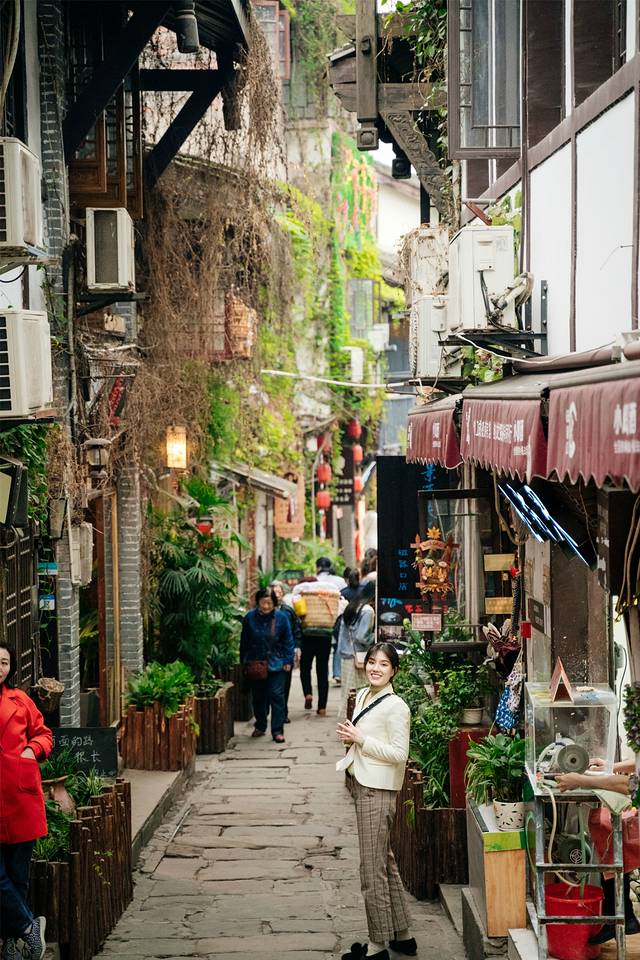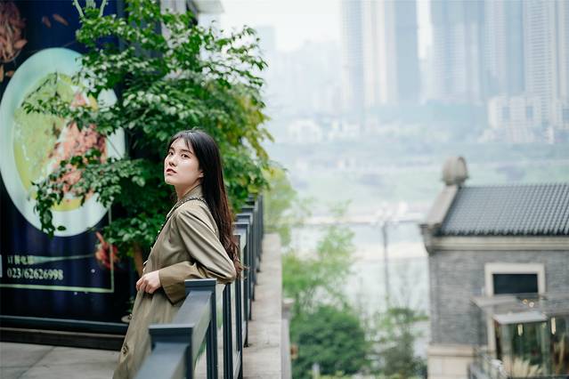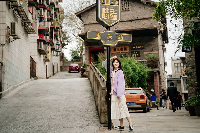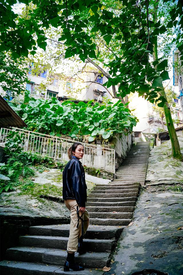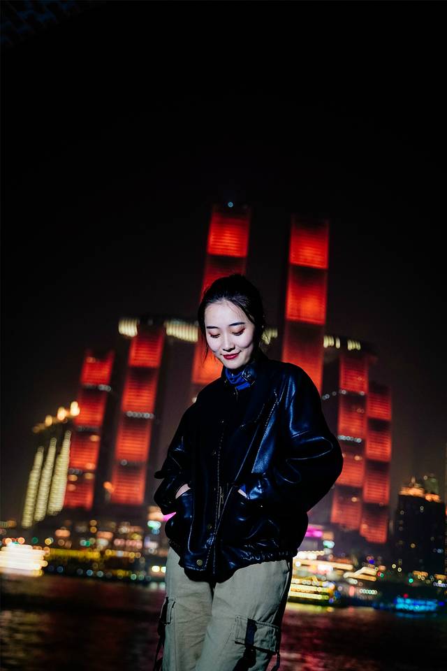 洪崖洞楼下可以拍个人美照~穿上皮衣摆一个超酷表情。