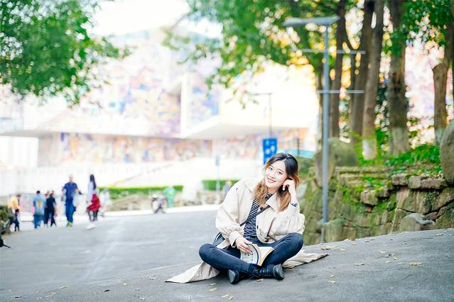 坐在校园里的小道下,席地而坐,看着朋友的镜头微笑。游客们欢声笑语,读书学子背着双肩包带着耳机大步赶着去其他地方。满眼都是绿色,阳光透过树荫,真的惬意舒服。