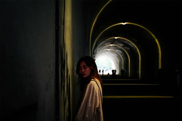 隧道里可以拍闪光灯拍。其实有光不会那么暗,但是调低了亮度也是非常有意境的。