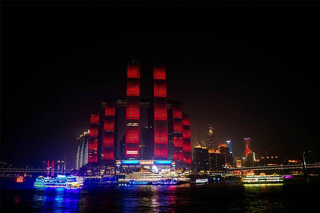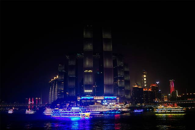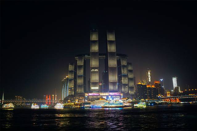 【朝天门夜游】这边有个码头可以夜游,有点像是上海外滩。江边夜景,沿江都有登船码头,售票处官价128元,网上售票会便宜一点。我们没有坐游轮。但是想要坐的小伙伴可以了解一下,这边都是全新豪华装修直接上甲板观景也可以。全程1小时,会看到洪崖洞、从千厮门大桥下路过、可以看到大剧院景色。我们太饿了就想先赶着去吃饭啦~