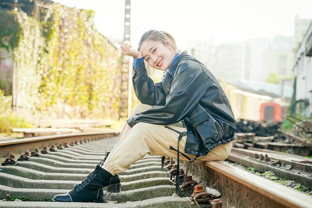 坐在铁轨中间,用手撑着头,腿可以伸长一点,看起来就会又瘦腿又长。今天穿的也很悠闲~