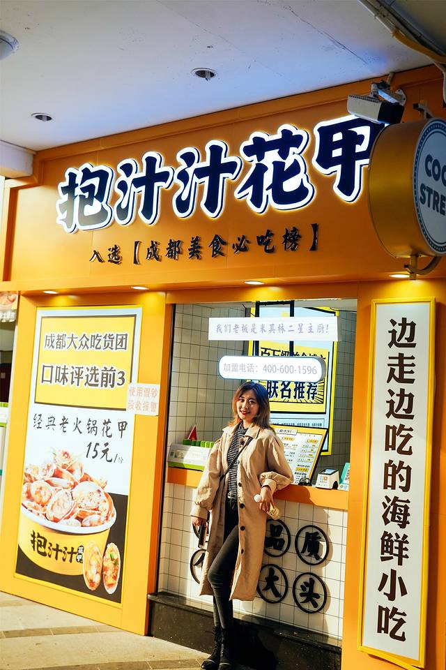 这家在路上格外显眼,简洁大方的招牌,黄色的底色然后大字“抱汁汁花甲”听起来好可爱,店铺虽然不大,但是感觉到的就是干净和卫生吧。招牌下就是各种名头“成都美食必吃榜”大众吃货团评选前三,嗯哼。我要吃了才知道你家是不是这么厉害~点起来。