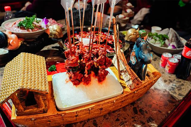 他们家的造型真的一绝。步步高升虾滑,草船借箭。哈哈哈,很有趣。荤菜都不错。虾滑和红汤锅很配,牛肉也比较嫩,有肉感且吸收了红汤的麻辣香。不算很辣。