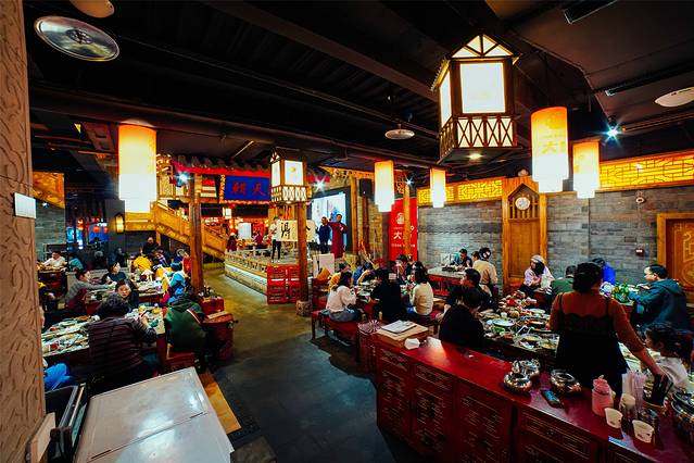 吃完小吃不够饱,来吃正餐吧。这家捞锅坝子老火锅,店面蛮宽敞的,入门口还有里面的装饰,都还让我停留在洪崖洞的夜景。这边就是在洪崖洞附近,临江支路与沧白路相交的路口。中式环境装修,店面宽敞,桌子也比较仿古。形态古香古色的装饰灯笼上印的都是店里菜品名称。有大厅的散座也有包房,包间在最里面,包间都是以本地老城门命名非常有趣。