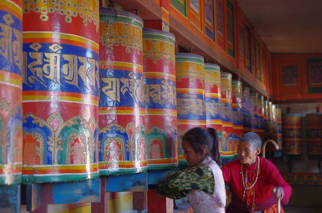 众多前来朝拜的藏民脸多有刻满岁月的沧桑,他们虔诚地转动着一个个转经筒,缓缓行进,沉静