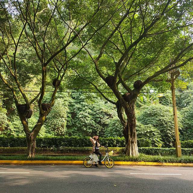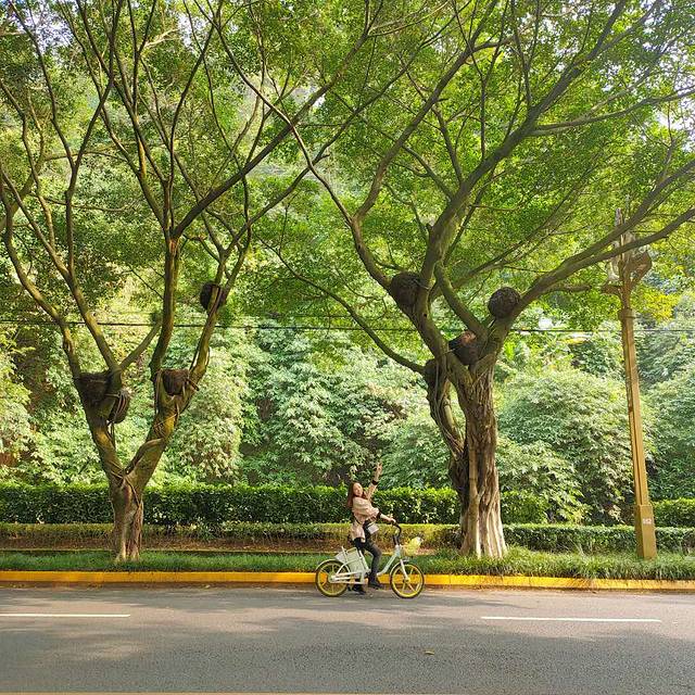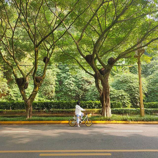 去的时候也不是旅游旺季,所以人不多,也不挤,售票处距离景区大门还有一段距离,当时还吐槽出租车司机把我们扔在这么远的地方,后来才发现这一段距离的景也太美了吧,一侧是岷江,一侧是繁茂树木,阳光透过树叶间的缝隙照射到地面的光,骑个自行车拍照只能用美好形容了。