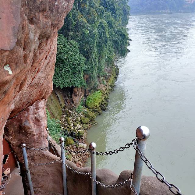 靠江的一侧路都比较窄,但是都是有护栏的,沿着护栏走到最底端,就来到了乐山大佛的脚下了。