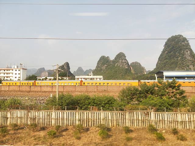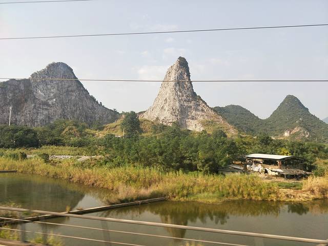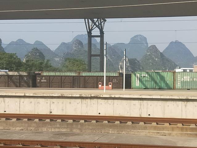 站台可见广西特色的石头山,错落间不见突兀,是温柔的泼墨山水画。