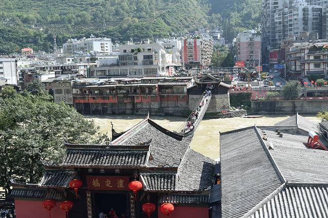 站在传统的吊脚楼前看现代的跨江大桥,感叹建筑的对比和惊奇。
