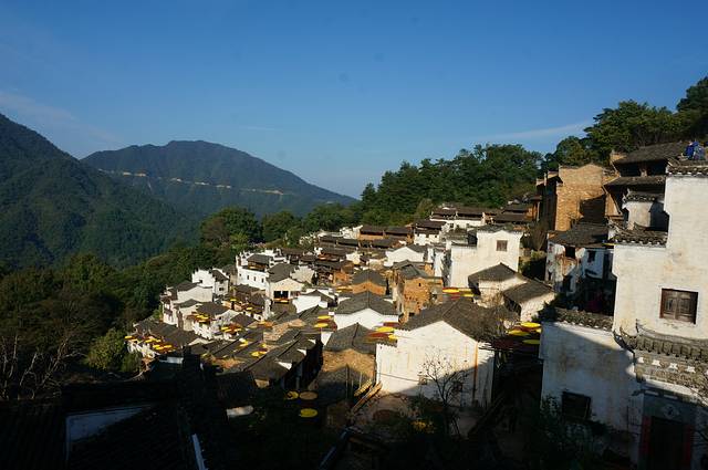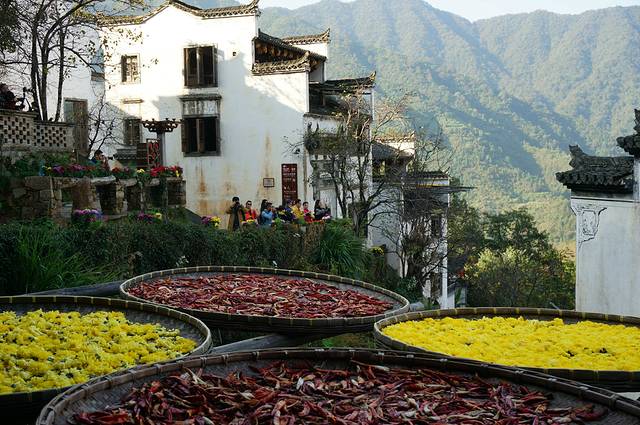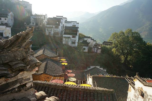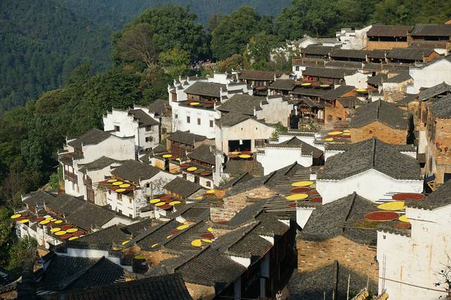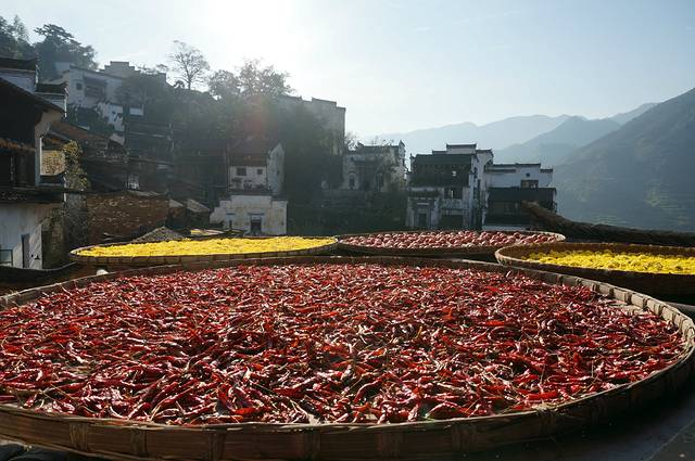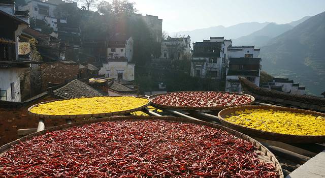 篁岭古村数百栋徽派古民居在百米落差的坡面错落有序,每当日出山头,晨曦映照,整个山间村落饱经沧桑的徽式民居土砖外墙与晒架上、圆圆晒匾里五彩缤纷丰收果实组合,绘就出世界独一无二的"晒秋"农俗景观,地域乡土文化。