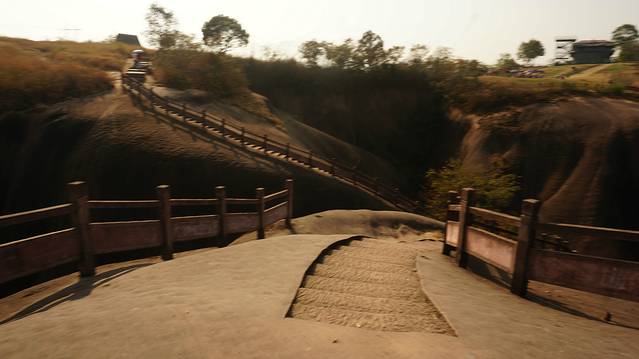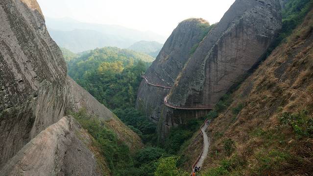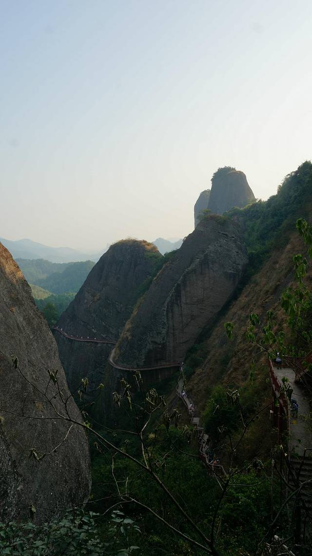 它的险峻地段都是寸草不生的悬崖峭壁,通往顶端的栈道都是只有两个人宽人工栈道,有的地方就只紧供一个人通行。