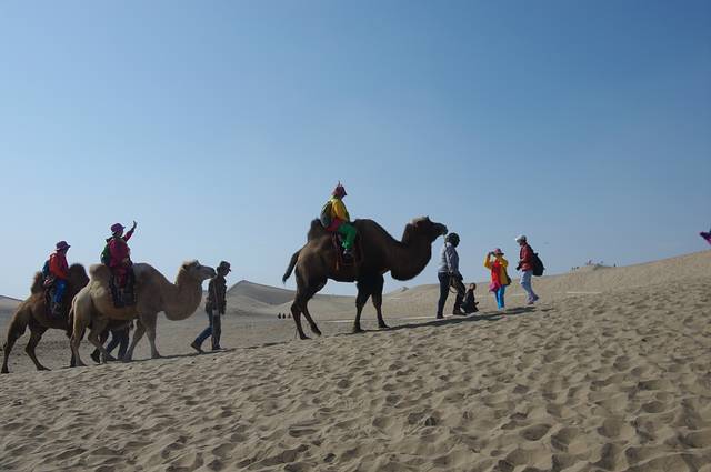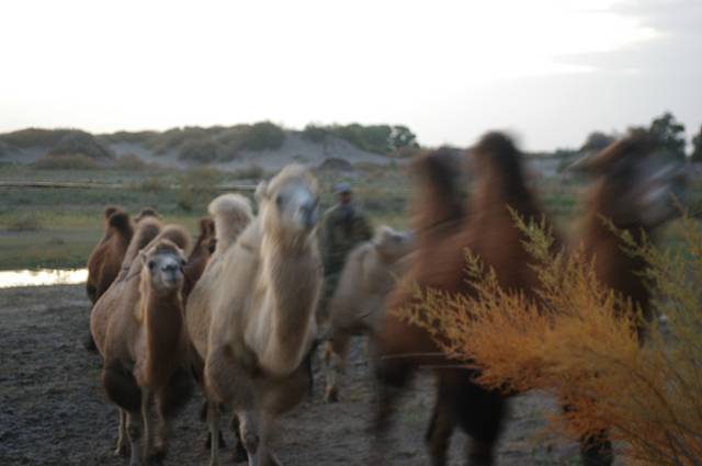 一群驼队,迎着朝阳,从沙丘开始走向沙漠深处,更显得沙漠的早晨如童话般的神秘。