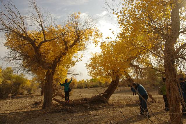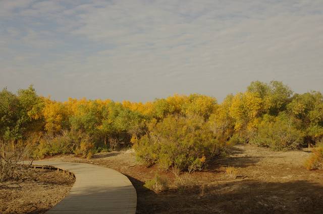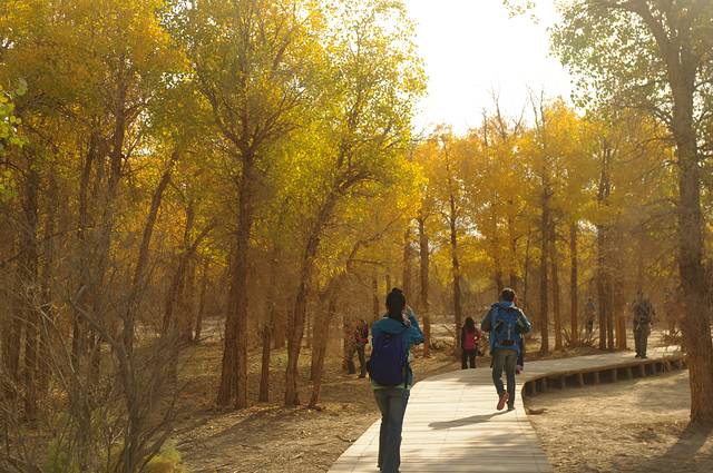 金秋漠野,凉风吹过,沿途胡杨林逐渐由绿变成浅黄,继而又变成深黄,一树的绚烂化作了满地的金黄。