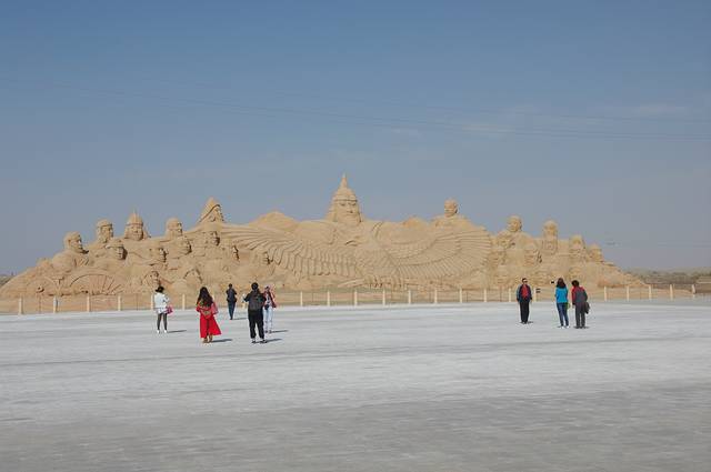 沙雕西边是带水的绿洲,沙漠里有个湖,沙漠边有河流,东边是无尽的沙漠,奇妙的组合。