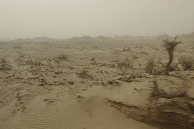 天气越来越不好了,当地人说看起来沙尘暴就要来了。果然,在我们离开这里去往黑水城遗址的路上,黄沙铺天盖地地追赶上我们了。从策克口岸到黑水古城遗址120公里,快到古城遗址的时候经过怪树林。