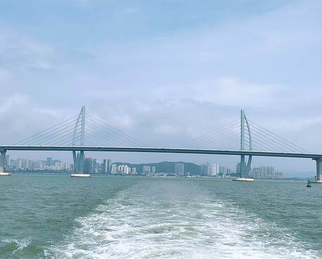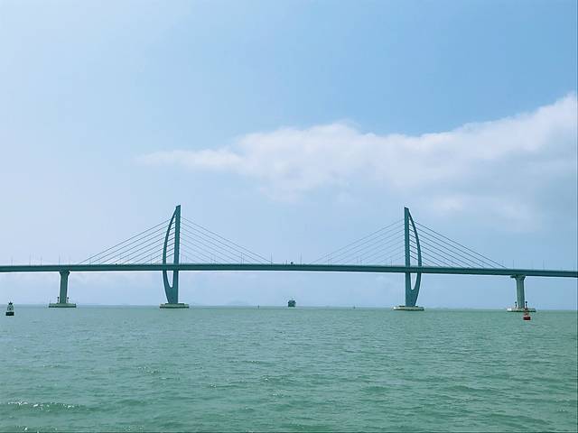 出码头一会就看见了壮观的港珠澳大桥,这是九洲航道桥的标志“风帆”桥塔,象征着伶仃洋上粤港澳三地通力合作建设港珠澳大桥一帆风顺;