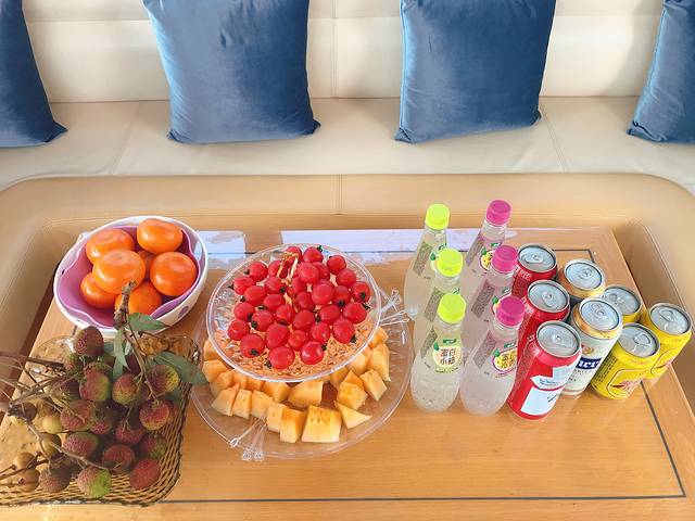 登船后就看见了美味的水果 都是游艇公司负责人高美人给准备的 很贴心了 还有晕船药 矿泉水 湿纸巾等等用品