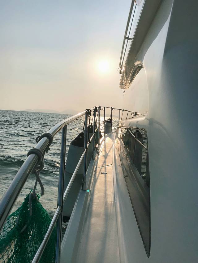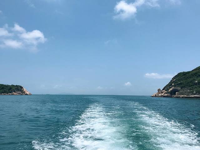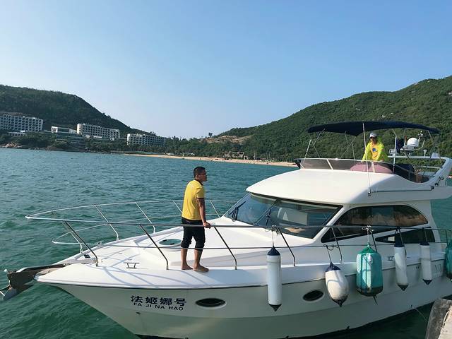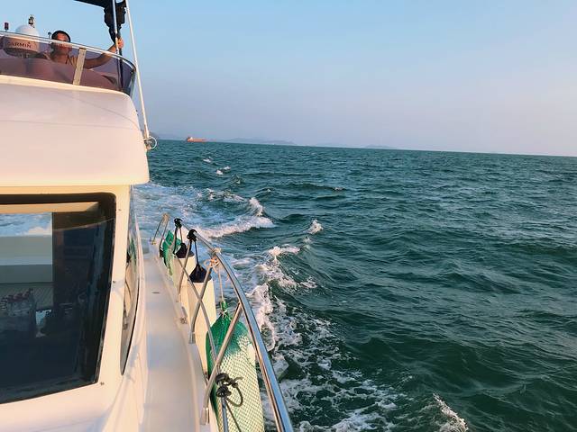 游泳结束后船长开着船在南沙湾码头这边接我们,很方便,看到帅帅的船长突然幸福感爆棚哈哈哈哈 因为坐着吹海风的时刻来了 但是上船的时候出了点小意外 朋友的衣服掉进海里了 好在船长机灵 速速的拿来了扫帚 把衣服给勾起来了 而后我们继续向前 开启未知的旅程
